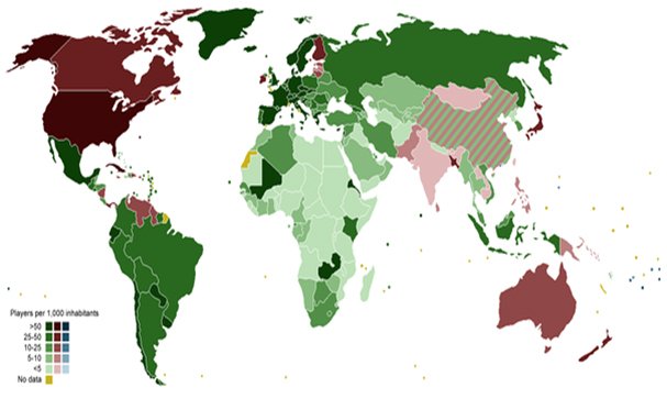 足球運動在世界各地區的流行程度;所有綠色國家均視足球為第一運動,分佈可見足球不愧被稱之為「世界第一運動」